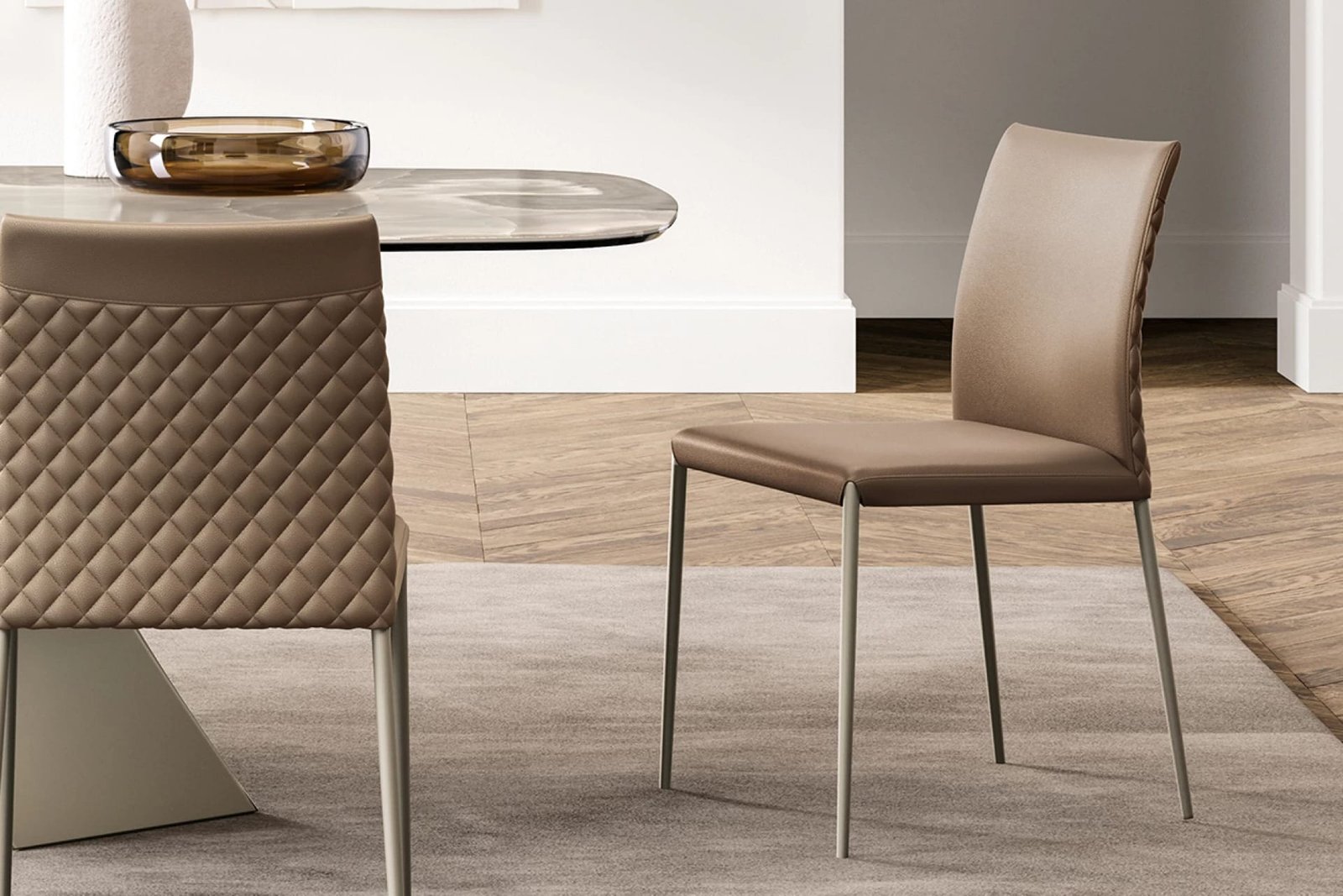The Bea Diamond Metal Legs Dining Chair by Eforma elevates modern dining with luxurious diamond-patterned upholstery and sleek metal legs. Suits high-end dining settings. Fully customisable and available in a variety of sizes and finishes. Contact us for the best possible price.