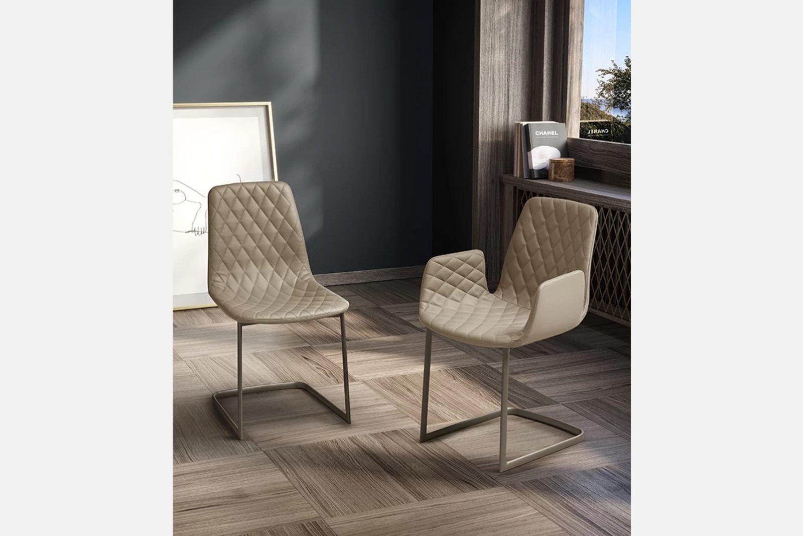 The Lenny Cantilever Dining Chair by Eforma features a unique cantilevered design, offering both comfort and a striking aesthetic. This contemporary chair can be fully customised to suit your dining room.