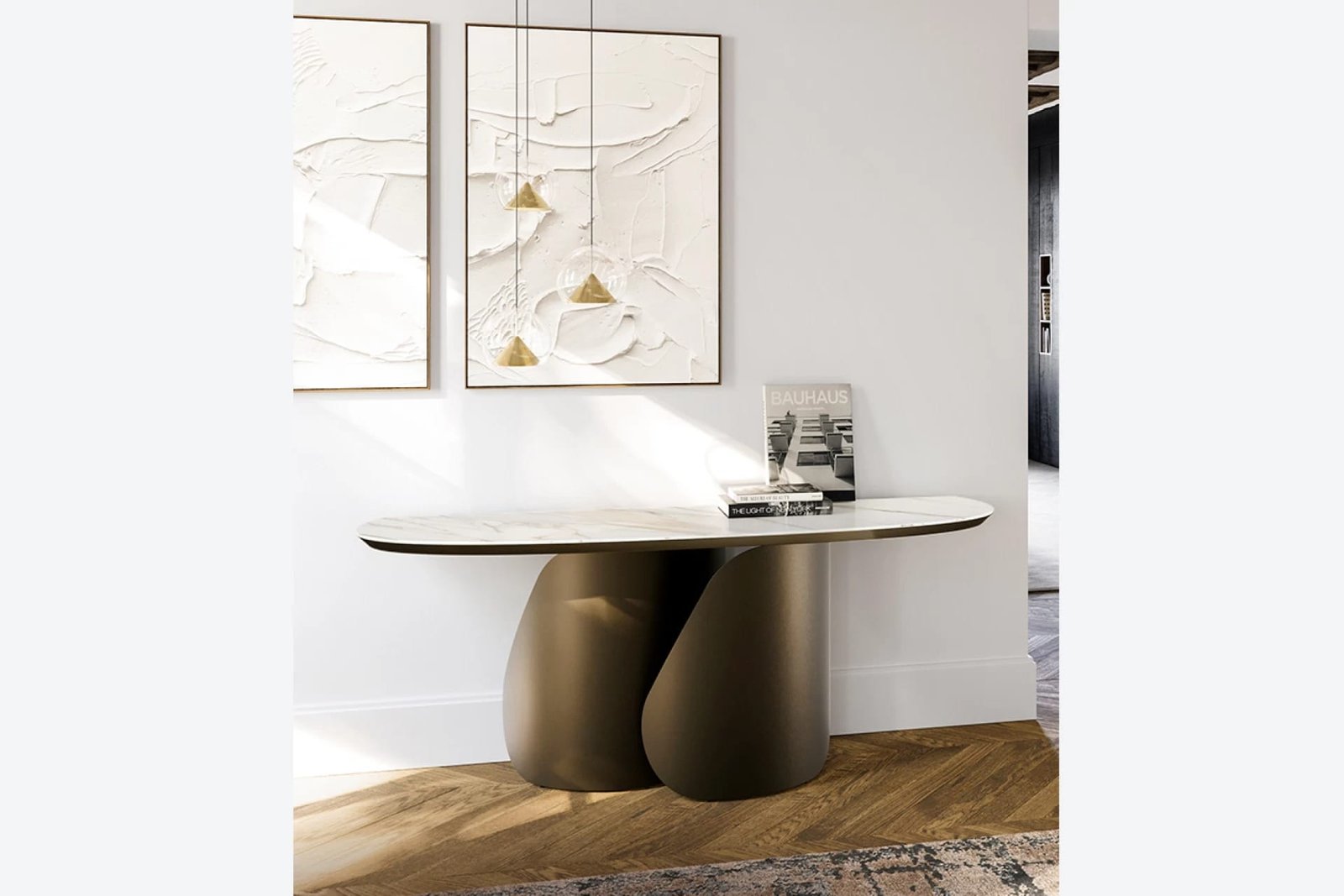 The Onda Ceramic Top Console Table by Eforma merges modern style with high-end materials. Durable ceramic surface pairs with bold architectural base presence. Fully customisable and available in a variety of sizes and finishes. Contact us for a tailored quote.