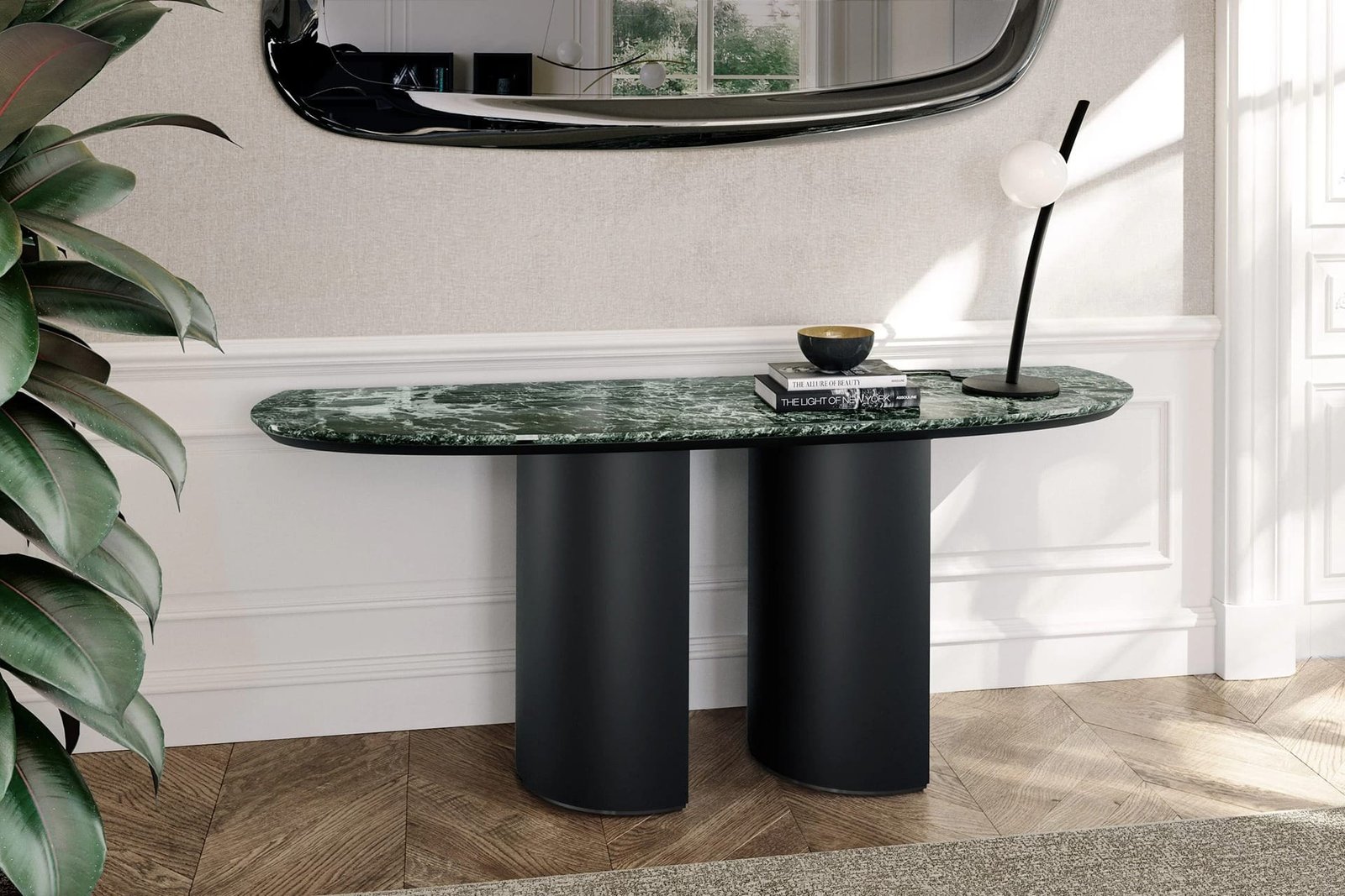 The Plai Marble Top Console Table by Eforma showcases refined luxury and design. Marble elevates the piece while the strong base provides striking contrast. Fully customisable and available in a variety of sizes and finishes. Contact us for the best possible price.