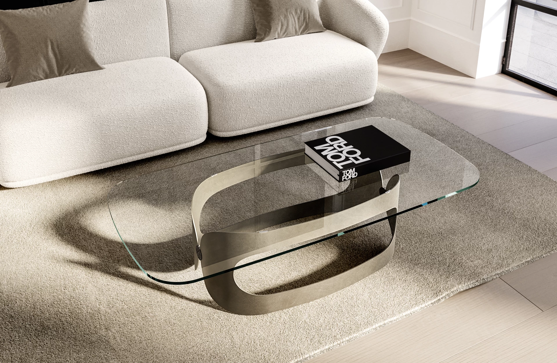 The Polifemo Low Glass Top Coffee Table by Eforma combines striking design with high-end materials. Glass creates elegant feel while base provides modern architectural presence. Fully customisable and available in a variety of sizes and finishes. Contact us for a tailored quote.