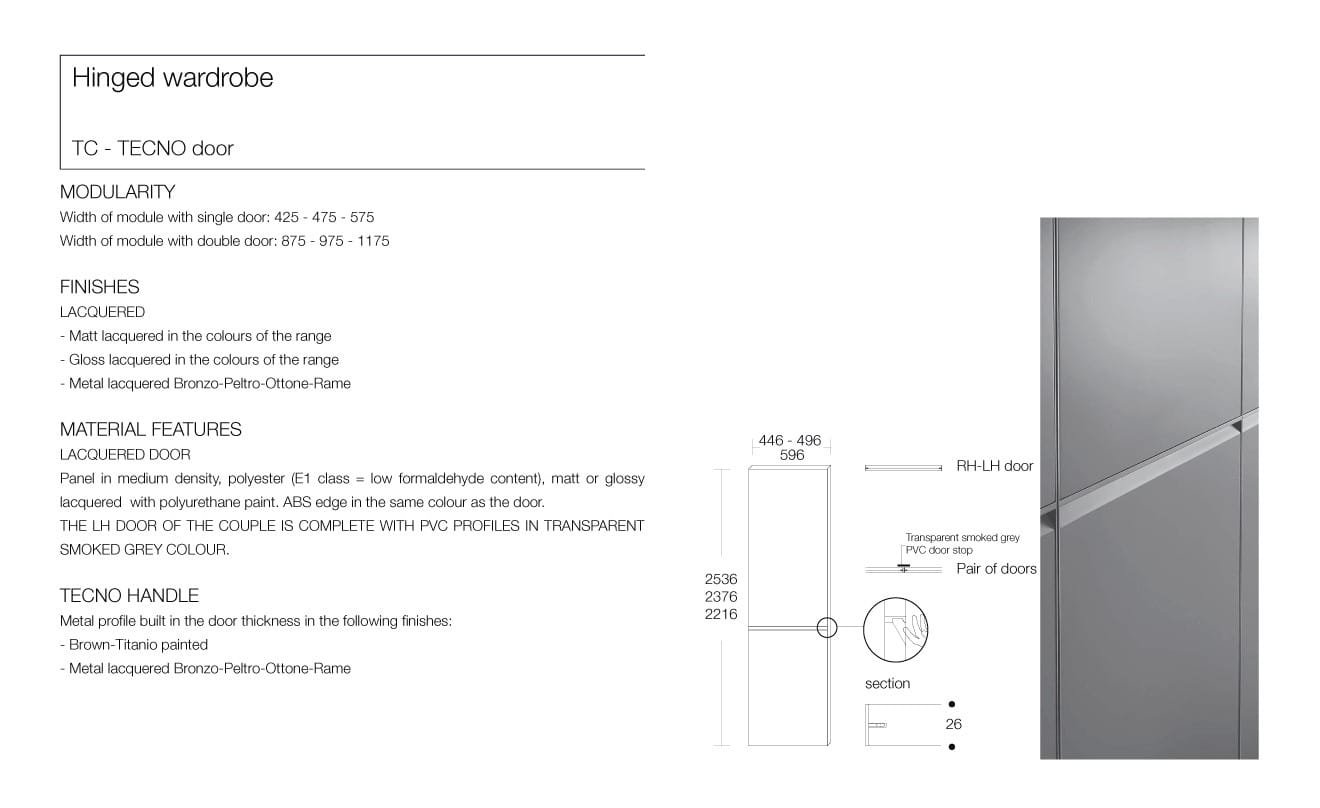 The Tecno Hinged Door Wardrobe by Logo combines modern design with exceptional functionality. Customisable in finishes, it brings a refined touch to any space while meeting all your storage needs.